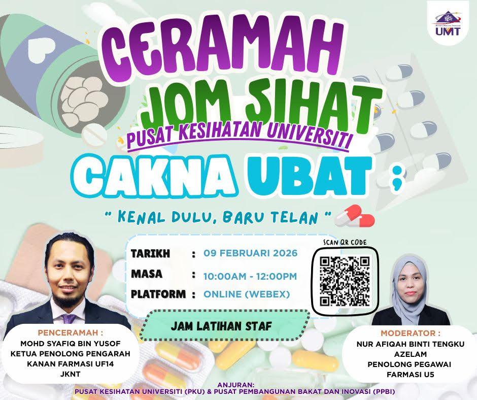 Sukacita dimaklumkan Pusat Kesihatan Universiti (PKU) dengan kerjasama Pusat Pembangunan Bakat dan Inovasi (PPBI) akan menganjurkan Ceramah Program Jom Sihat UMT 2026, seperti ketetapan berikut: